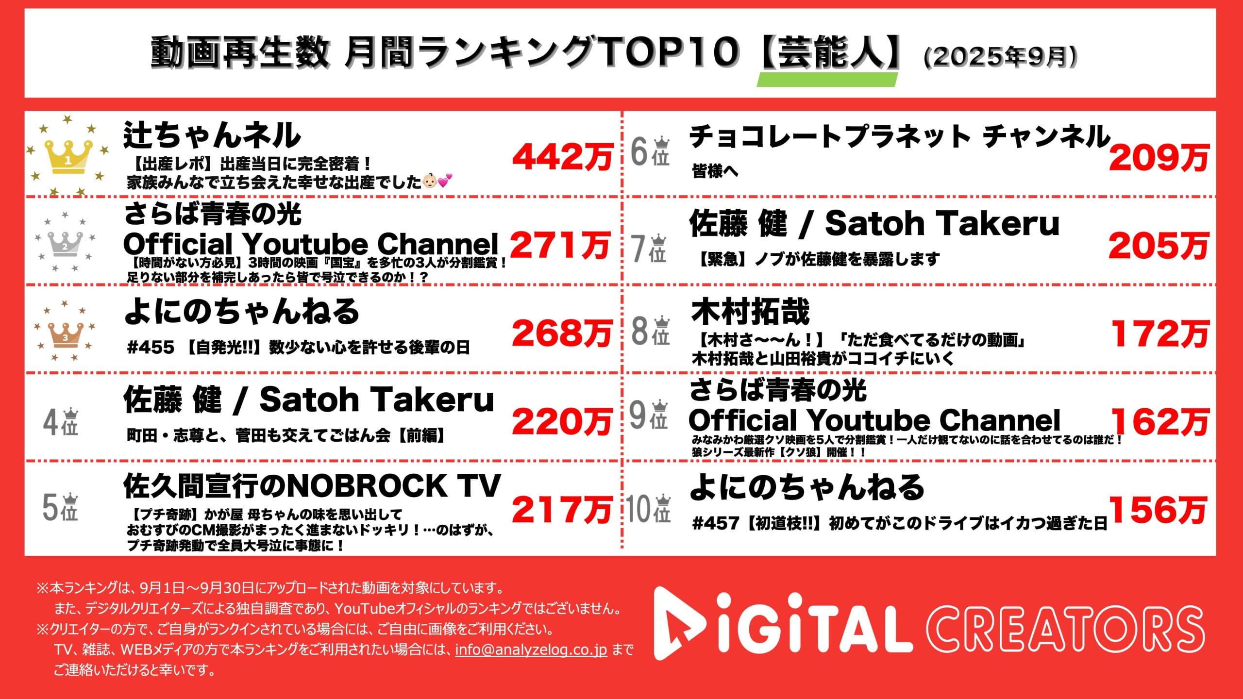 月間YouTube再生数ランキング芸能人部門を発表!辻希美、第5子出産!出産密着動画で、リアルを公開‼さらば青春の光、映画「国宝」を3人で分割して鑑賞したら、感動できるのか⁉よにのちゃんねる、なにわ男子・道枝駿祐コラボ‼